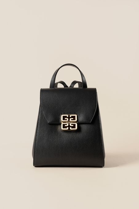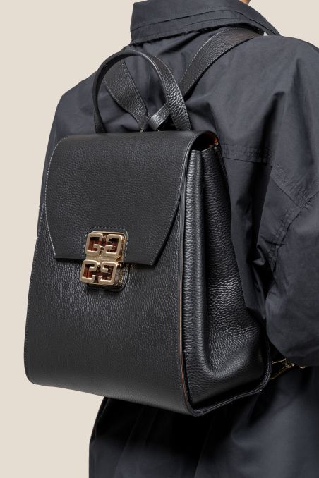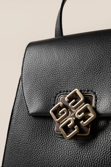 Zaino con patta frontale e chiusura a girello cucita interamente a mano. L'accessorio monogramma "Gironacci", in metallo satinato color oro chiaro, è impreziosito da inserti in legno di frassino tinto noce.