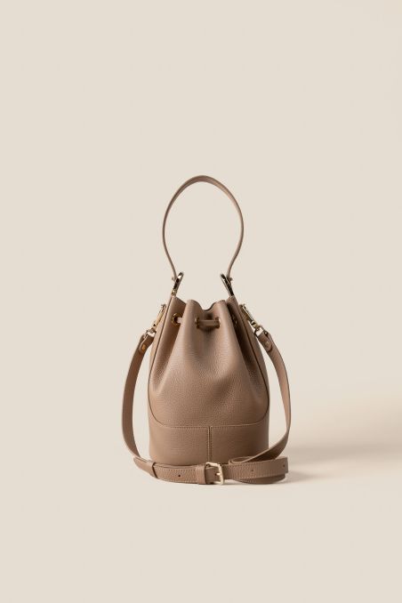 Secchiello in preziosa pelle bottalata, pratica e glamour allo stesso tempo, presenta una chiusura a sacchetto.