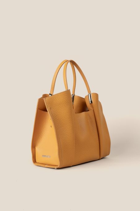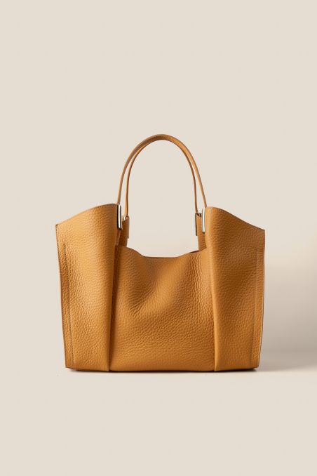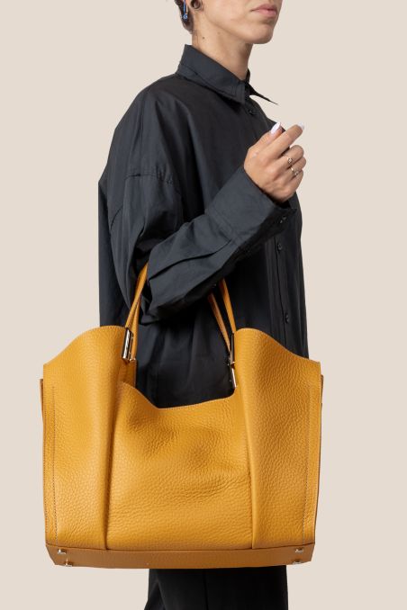 Maxi Bag realizzata in preziosa pelle di vitello bottalato pieno fiore con particolare rifinizione double face tono su tono all'interno, presenti elegante minuterie a contrasto in metallo galvanizzato in oro chiaro.