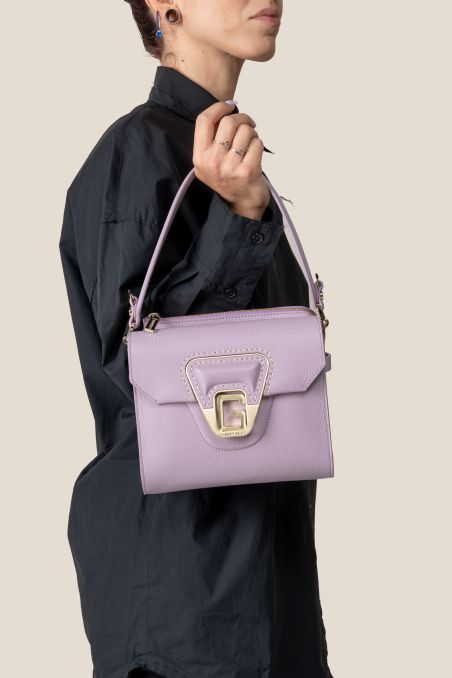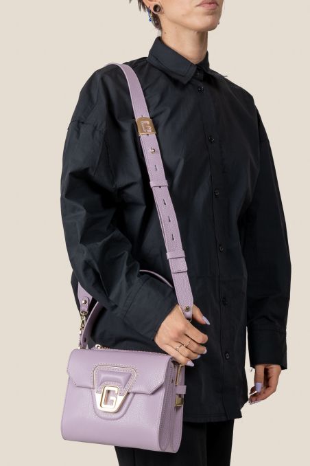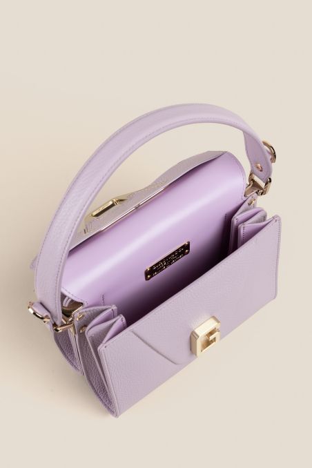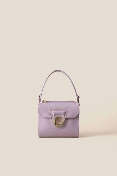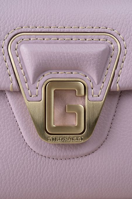 Borsa a mano realizzata in preziosa pelle di vitello bottalato accoppiata internamente con pellame di colore a contrasto, dallo stile retrò presenta sul davanti un primo scoparto con chiusura a patta calamitata, caratterizzata dall'inconfondibile G in metallo galvanizzato oro chiaro color oro chiaro con effetto spazzolato, inserita con cucitura effettuata a mano con filo cerato.