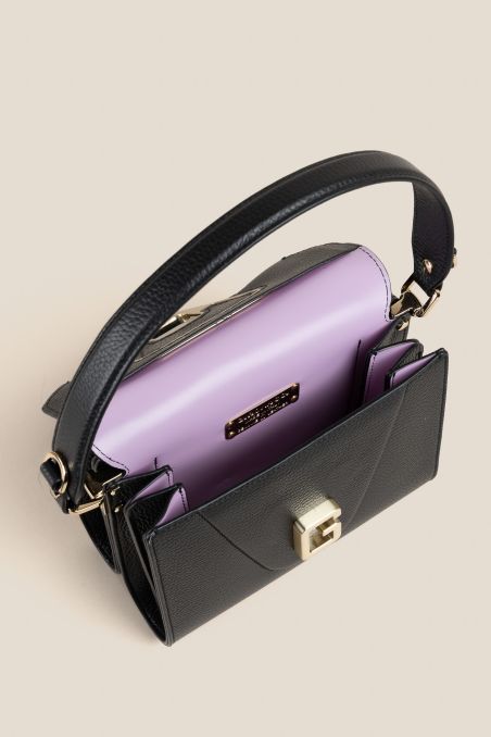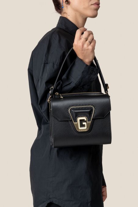 Borsa a mano realizzata in preziosa pelle di vitello bottalato accoppiata internamente con pellame di colore a contrasto, dallo stile retrò presenta sul davanti un primo scoparto con chiusura a patta calamitata, caratterizzata dall'inconfondibile G in metallo galvanizzato oro chiaro color oro chiaro con effetto spazzolato, inserita con cucitura effettuata a mano con filo cerato.