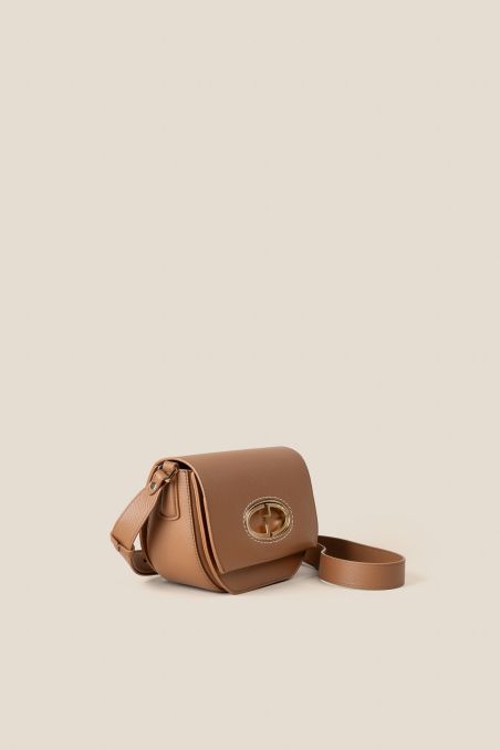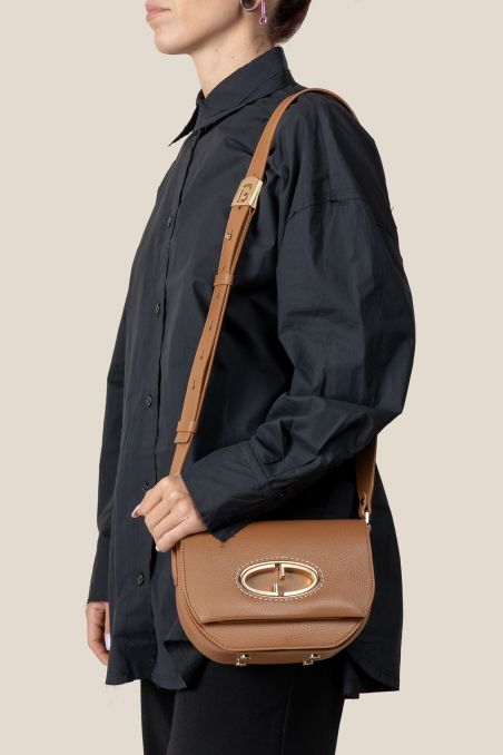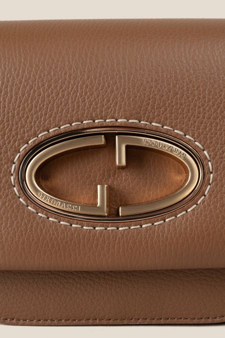 Chiusura della borsa con patta calamitata, caratterizzata dal monogramma "Gironacci" contraddistinto dall' inconfondile "G" è realizzato in metallo galvanizzato color oro chiaro spazzolato.
