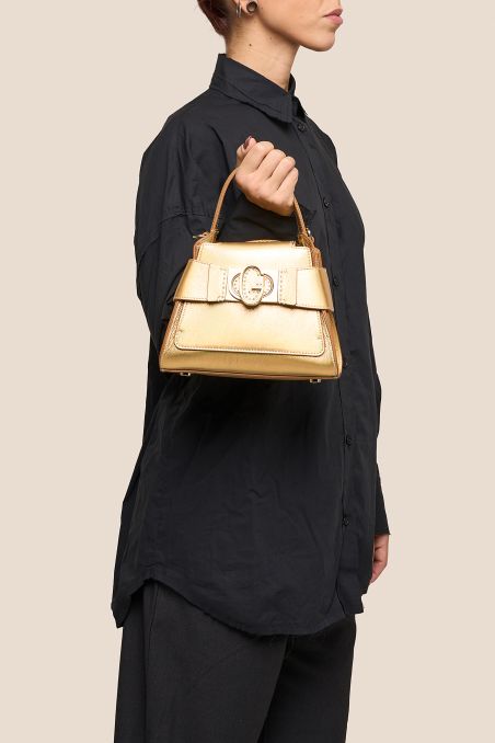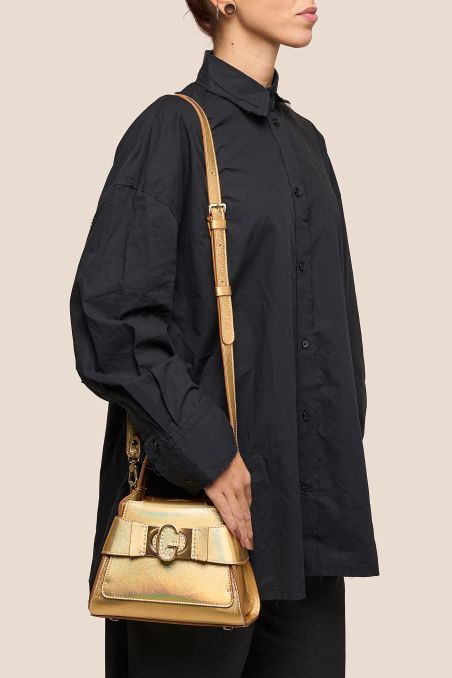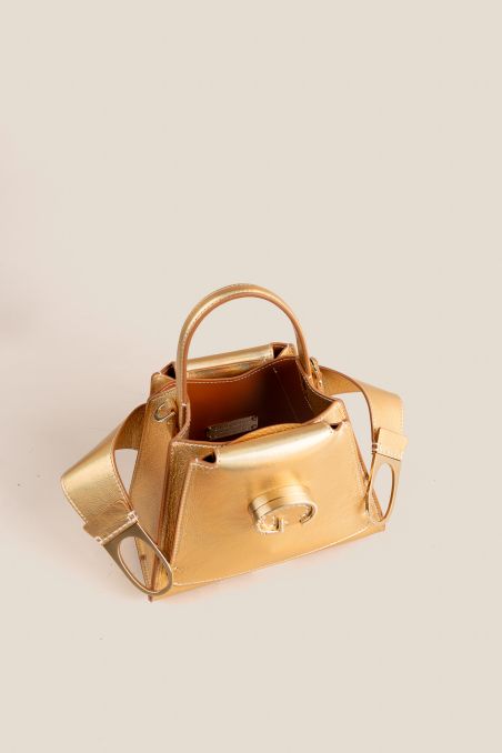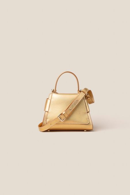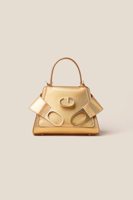 Mini bag in pelle di vitello con finitura metallizzata accoppiata internamente con pellame di colore a contrasto.