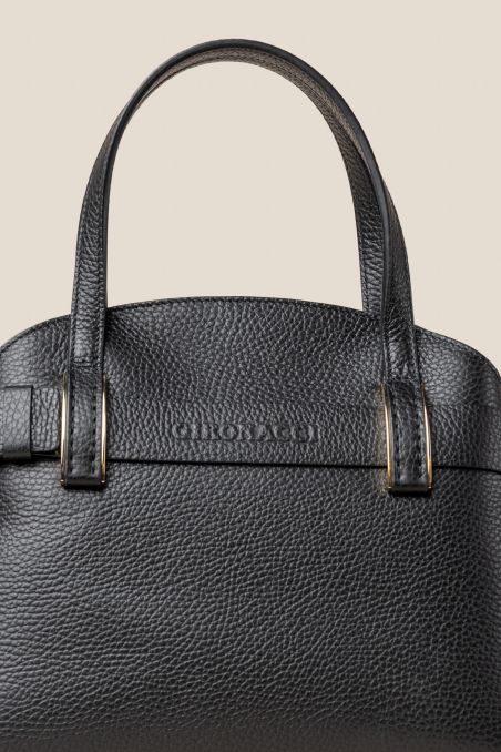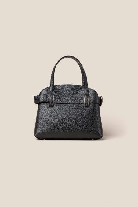 Borsa a mano in stile mini Birkin con cinta passante, realizzata in preziosa pelle di vitello semilucida dalla grana incisa regolare, corposa e piena al tatto, accoppiata internamente con pellame di colore a contrasto, chiusura interna con doppia calamita.