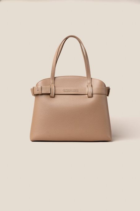 Borsa a mano in stile Birkin con cinta passante, realizzata in preziosa pelle di vitello semilucida dalla grana incisa regolare, corposa e piena al tatto, accoppiata internamente con pellame di colore a contrasto, chiusura interna con doppia calamita.