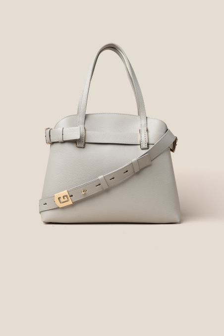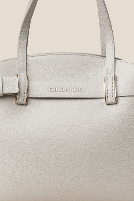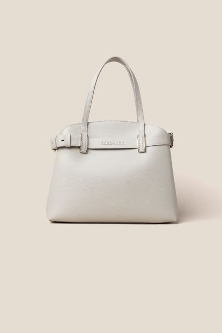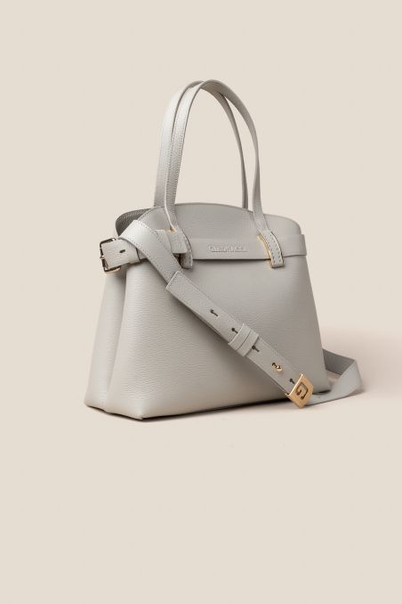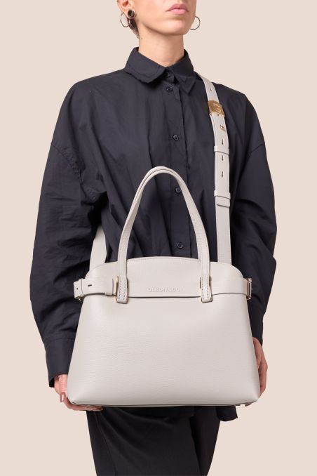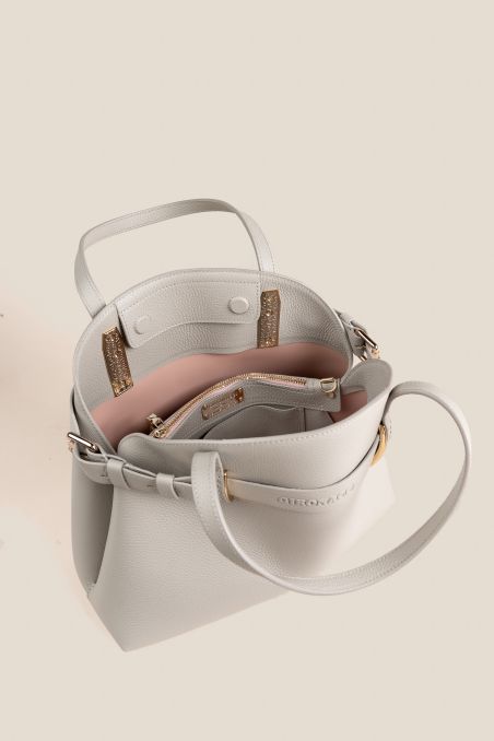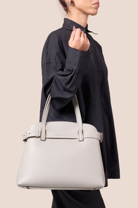 Borsa a mano in stile Birkin con cinta passante, realizzata in preziosa pelle di vitello semilucida dalla grana incisa regolare, corposa e piena al tatto, accoppiata internamente con pellame di colore a contrasto, chiusura interna con doppia calamita.