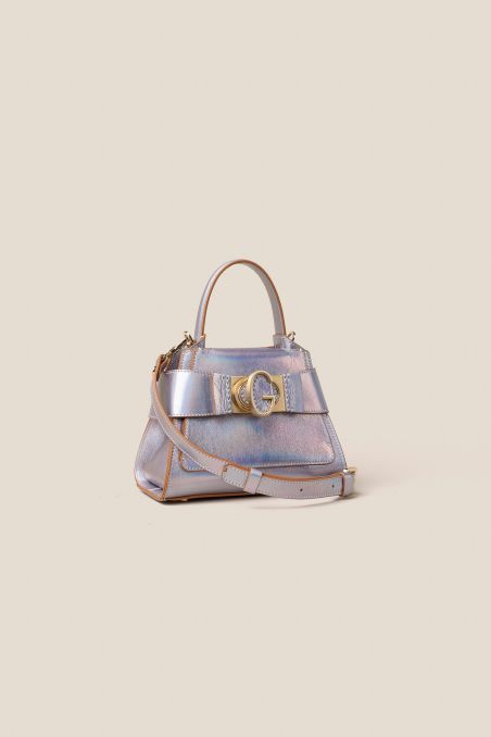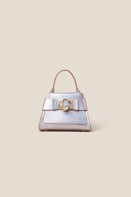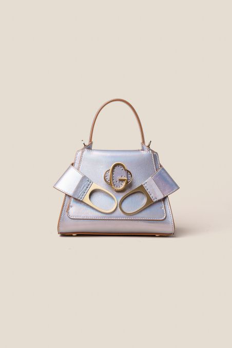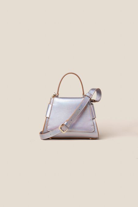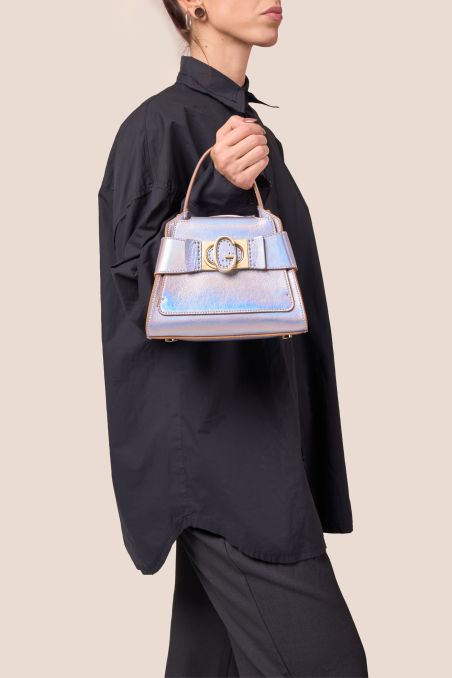 Mini bag in pelle di vitello con finitura metallizzata accoppiata internamente con pellame di colore a contrasto.