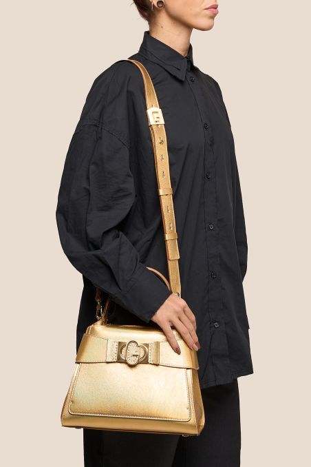 I piedini in metallo logati proteggono la borsa dalle superfici, mentre le minuterie in metallo galvanizzato oro chiaro aggiungono un tocco di eleganza e praticità.