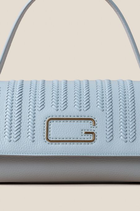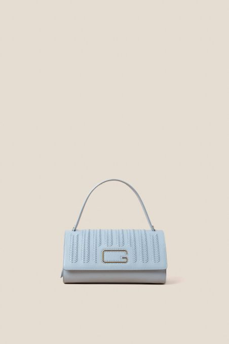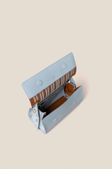 Borsa a mano artigianale in vera pelle martellata italiana, impreziosita da una lavorazione frontale a intreccio realizzata manualmente con l’inserimento di un laccio in pelle.